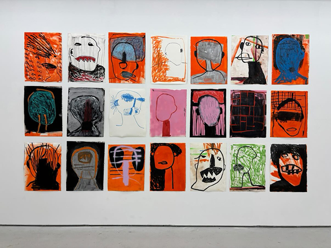 The installation shown here—drawings from White Noise (2025)—captures that circular intensity. The grid of distorted heads functions like a chorus of internal voices. Each piece mirrors another, argues with another, or breaks away from the logic of the group entirely. Bright, acidic backgrounds clash with heavy black lines. Some figures appear stripped bare. Others feel bound or fractured, caught in a kind of psychological pressure. Together, they create a rhythm of interruption and release, as if the whole collection inhales and exhales in uneven breaths.